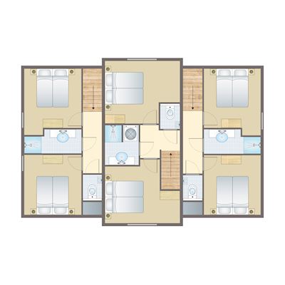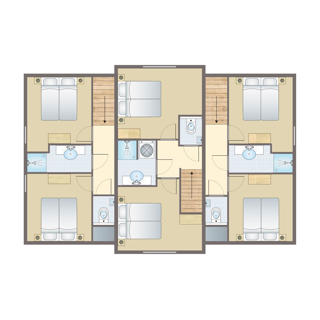 - Six bedrooms with two single box spring beds on the first floor